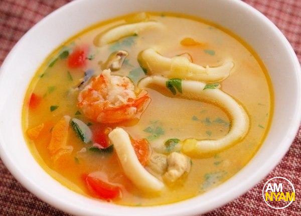 Получившуюся мучную смесь перемешать, добавить в суп, довести до кипения, посолить и поперчить. Выложить в суп все морепродукты, довести до кипения и варить еще 2 минуты. Снять с огня и приправить зеленью петрушки и соусом чили.